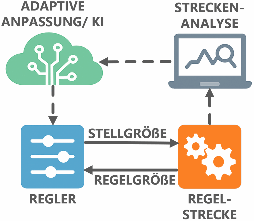 Ein aktueller Forschungsschwerpunkt liegt in der Weiterentwicklung dieser Systeme hin zu KI-gestützten adaptiven Regelungen. Während klassische adaptive Regler auf mathematischen Modellen und Schätzverfahren basieren, nutzen moderne Ansätze künstliche Intelligenz, um komplexe und nichtlineare Zusammenhänge im Prozessverhalten zu erfassen. Mithilfe von maschinellem Lernen oder neuronalen Netzen kann der Regler Muster erkennen, Störungen prognostizieren und daraus vorausschauende Anpassungsstrategien ableiten. So wird die Regelung nicht nur reaktiv, sondern zunehmend proaktiv und selbstlernend.